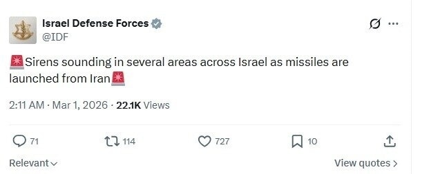 आईडीएफ ने बताया कि ईरान ने शनिवार देर रात को इजरायल की ओर कई और मिसाइलें दागीं हैं, जिसके कारण कई इलाकों में सायरनों की आवाज सुनाई दे रही. इस बारे में इजरायली सेना ने सोशल मीडिया प्लेटफॉर्म एक्स पर जानकारी दी है.