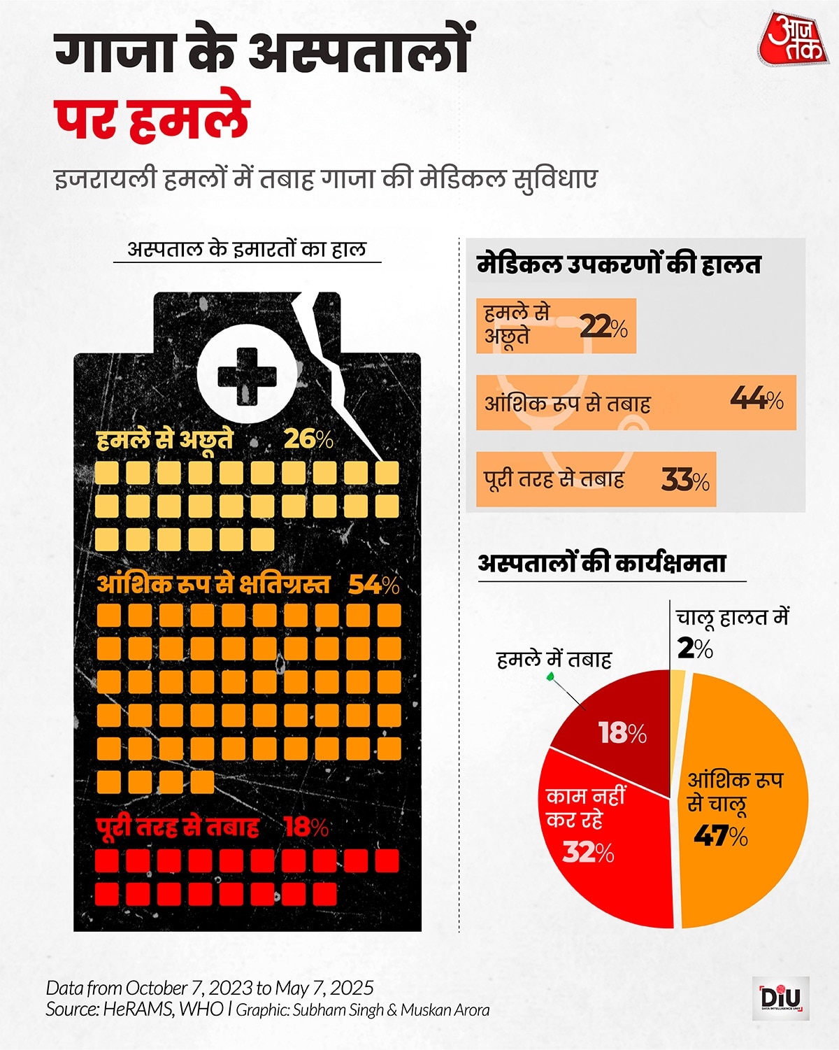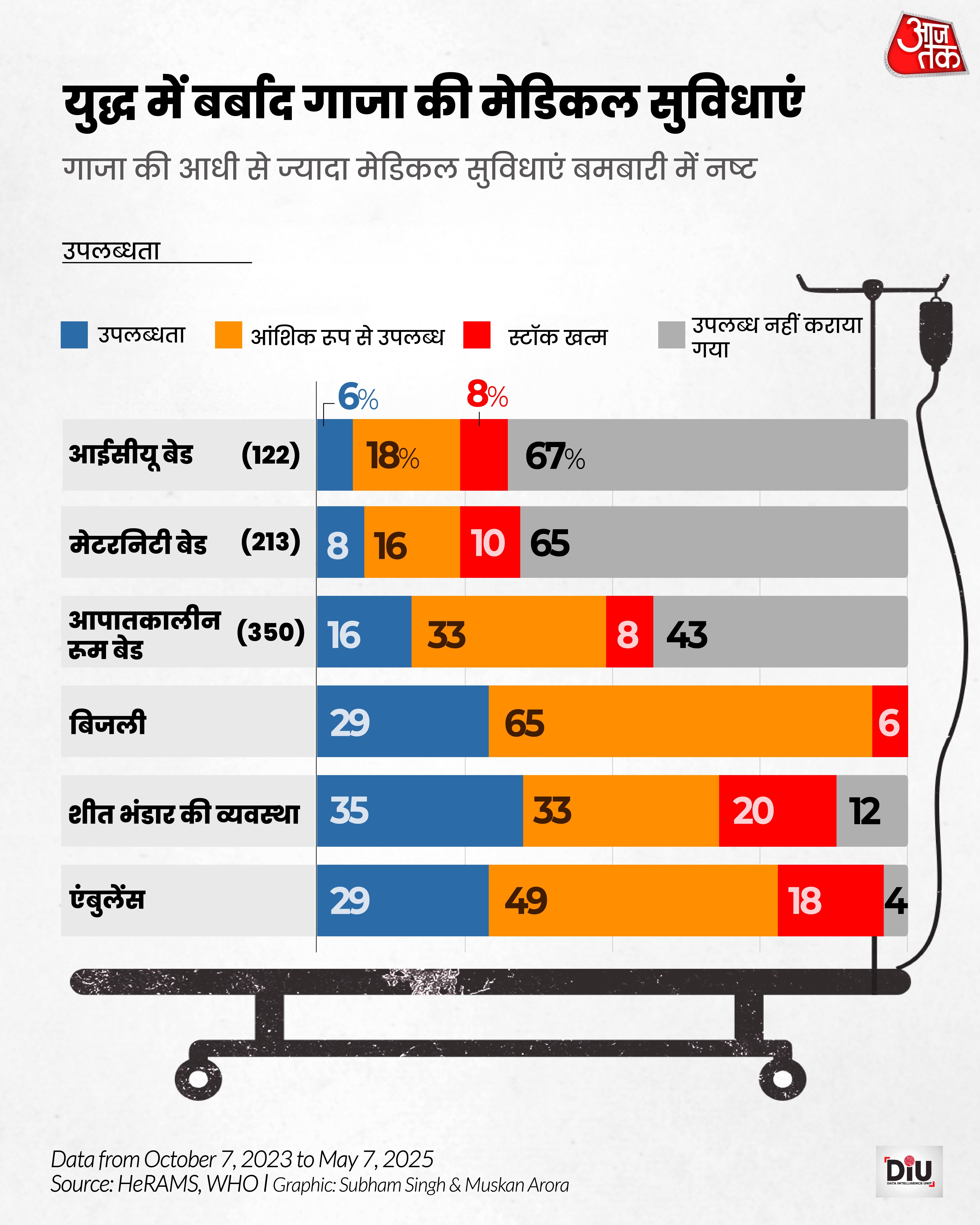 डब्ल्यूएचओ के अनुसार, 7 अक्टूबर 2023 से लेकर इस साल 7 मई के बीच, इजरायल ने गाजा में कुल 686 हमले किए, जिससे 122 स्वास्थ्य सुविधाएं और 33 अस्पताल प्रभावित हुए. करीब 180 एंबुलेंस भी नष्ट हो गईं. अभी, राफा में कोई भी प्राथमिक और माध्यमिक स्वास्थ्य सेवा काम नहीं कर रही है. इस दौरान 1,400 से अधिक डॉक्टर, नर्स और अन्य चिकित्सा कर्मचारी भी मारे गए हैं.