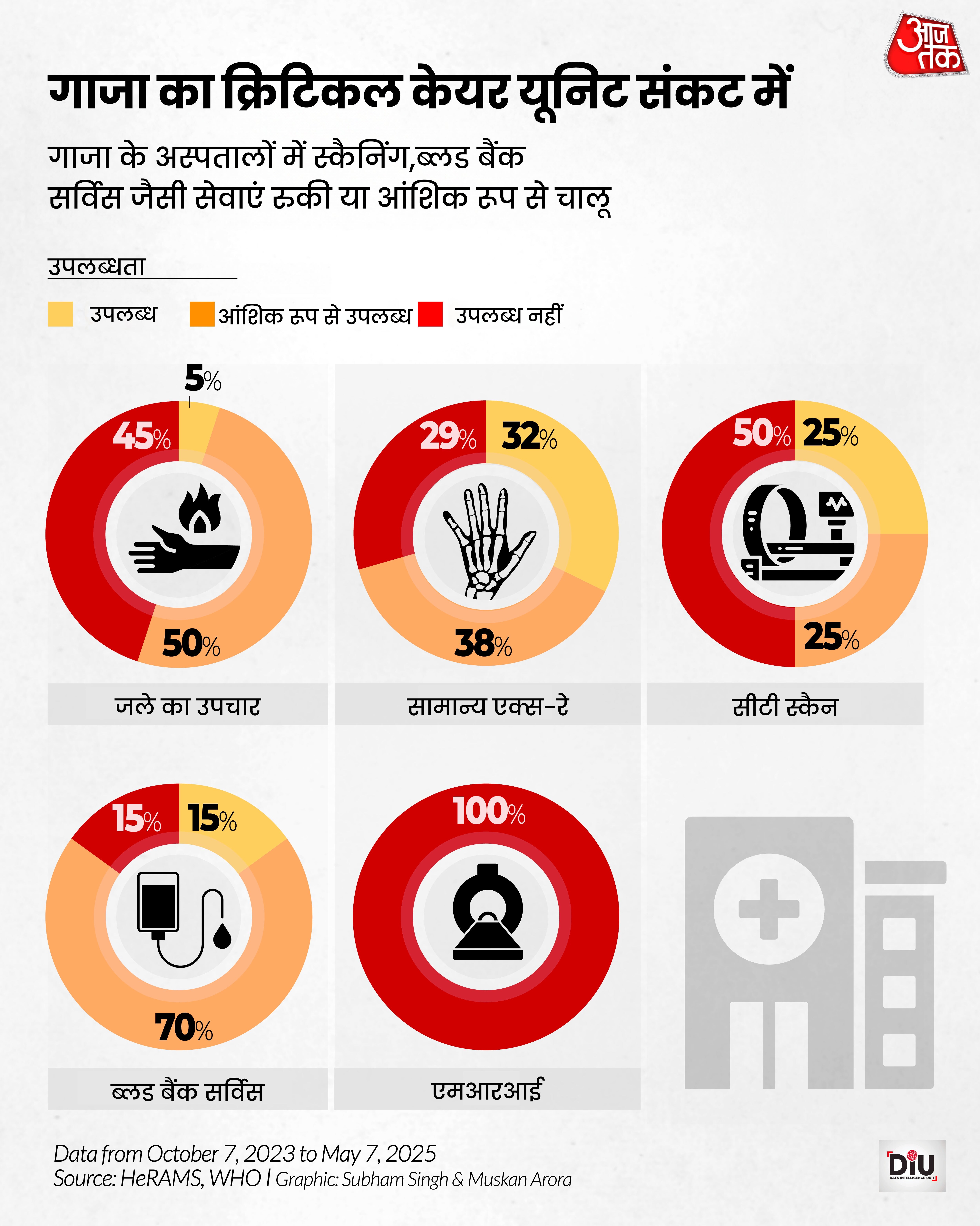 गाजा के किसी भी सरकारी अस्पताल, फील्ड अस्पताल या मेडिकल यूनिट में मैग्नेटिक रेजोनेंस इमेजिंग या एमआरआई की सेवा नहीं है. केवल पांच प्रतिशत में ही जले के इलाज की सेवा है, 32 प्रतिशत में बुनियादी एक्स-रे सुविधाएं हैं, 25 प्रतिशत में कंप्यूटेड टोमोग्राफी या सीटी स्कैन सेवाएं हैं, और केवल 15 प्रतिशत में ही ब्लड बैंक उपलब्ध है.