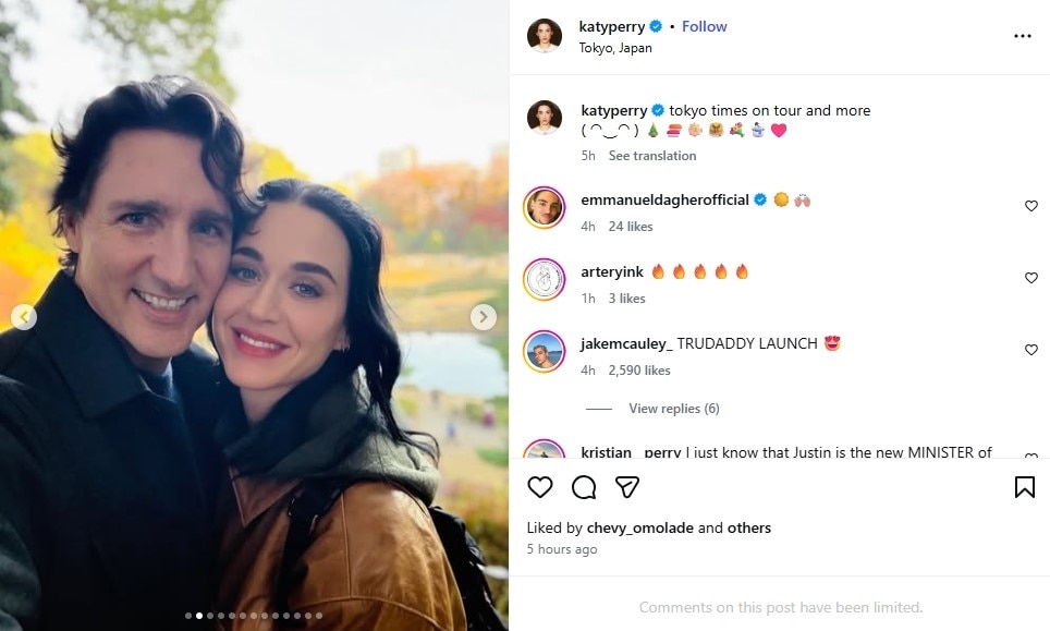 दरअसल, कैटी पेरी ने अपनी चल रही 'लाइफटाइम्स टूर' के हिस्से के तौर पर इस यात्रा की फोटो और वीडियोज शेयर किए. एक फोटो में पेरी और 53 वर्षीय ट्रूडो एक साथ सेल्फी लेते दिखाई दे रहे हैं, जबकि एक वीडियो में दोनों को साथ में खाना खाते और एक आर्ट एग्जीबिट में समय बिताते देखा जा सकता है. पेरी ने पोस्ट के कैप्शन में लिखा, “टोक्यो टाइम्स ऑन टूर एंड मोर (sic)”.