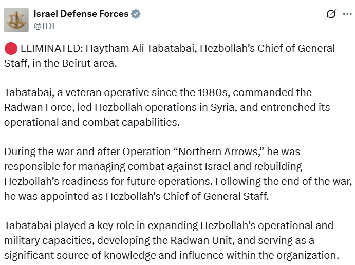 IDF के अनुसार, तबताबाई 1980 के दशक से हिज्बुल्लाह का सक्रिय ऑपरेटर था. उसने हिज्बुल्लाह की विशेष रेडवान फोर्स बनाई, सीरिया में ऑपरेशन की निगरानी की और समूह की सैन्य ताकत बढ़ाई. पिछले साल के युद्ध और ऑपरेशन नॉर्दर्न एरोस के बाद उसने इजरायल-लेबनान सीमा पर लड़ाई का नेतृत्व किया और बाद में हिज्बुल्लाह का चीफ ऑफ जनरल स्टाफ बना.