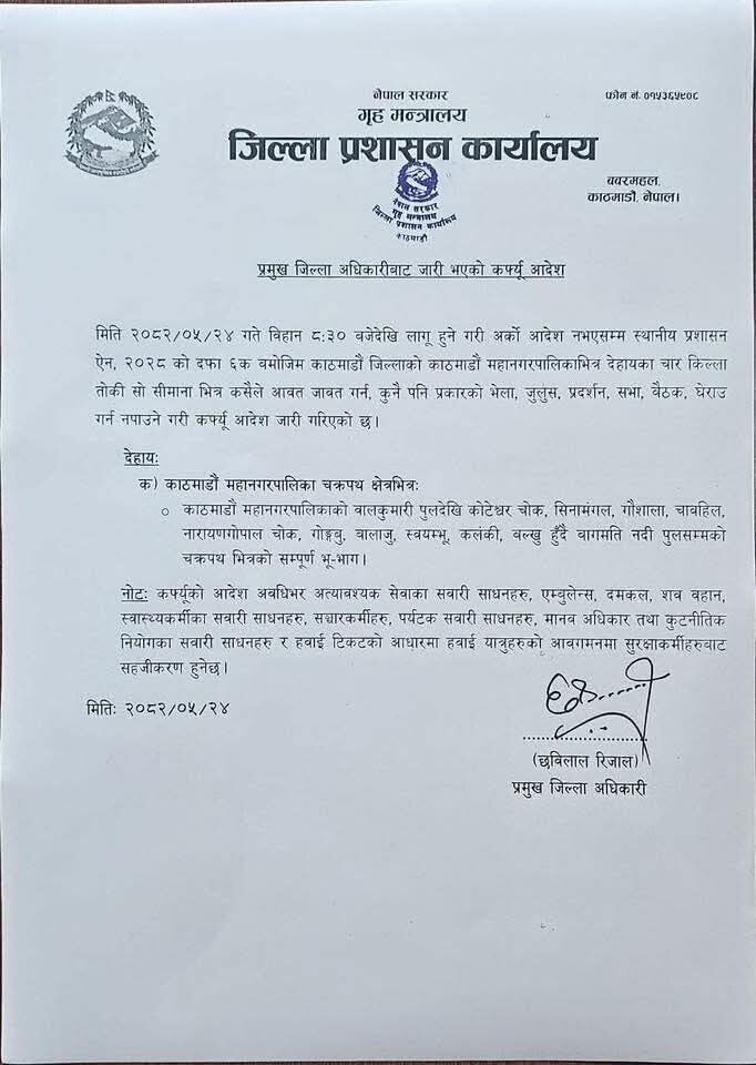 ललितपुर जिला प्रशासन कार्यालय ने मंगलवार को सुबह 9 बजे से रात 12 बजे तक कर्फ्यू लगाने का आदेश दिया. मुख्य जिला अधिकारी सुमन घिमिरे ने बताया कि यह आदेश वार्ड 2, 4, 9, 18 और 25 के कुछ हिस्सों में लागू होगा, जिनमें भैसेपाटी, सानेपा और च्यासल शामिल हैं.