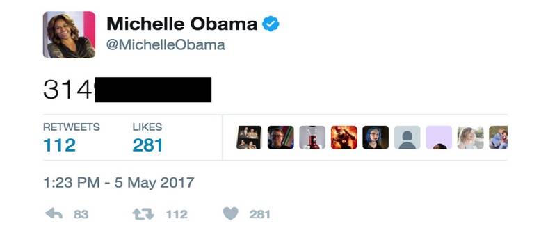 पूर्व प्रथम महिला मिशेल ओबामा के ट्विटर पर 76 लाख 70 हजार फोलोवर हैं. यह नंबर स्पष्ट रूप से व्हाइट हाउस के पूर्व रचनात्मक डिजिटल रणनीतिकार डंकन वाल्फे का है. ट्वीट को तुरंत ही हटा भी लिया गया. ओबामा के लिए काम करने वाले एक अधिकारी ने बताया कि यह भूलवश हो गया और अकाउंट हैक नहीं हुआ है. मिशेल की इस गलती के बाद सोशल मीडिया पर इस नंबर के बारे में लोगों ने