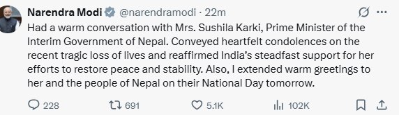 सोशल मीडिया प्लेटफॉर्म पर नेपाल की अंतरिम प्रधानमंत्री से बातचीत की जानकारी देते हुए पीएम मोदी ने आश्वासन दिया कि भारत नेपाल में शांति और स्थिरता बहाल करने के उनके प्रयासों में पूरी तरह सहयोग करता रहेगा. उन्होंने कहा कि भारत और नेपाल के बीच ऐतिहासिक और सांस्कृतिक संबंध हमेशा मजबूत रहे हैं और आगे भी रहेंगे.