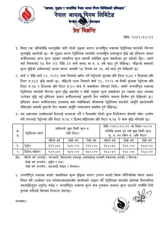 नेपाल आयल निगम ने बताया कि मध्यपूर्व में जारी संघर्ष के कारण अंतरराष्ट्रीय बाजार में पेट्रोलियम पदार्थों की कीमतों में लगातार बढ़ोतरी हो रही है. निगम ने यह भी कहा कि उसे पिछले 15 दिनों में लगभग 5 अरब नेपाली रुपये का नुकसान हुआ है, जिसके कारण कीमतों में बढ़ोतरी करना जरूरी हो गया था.