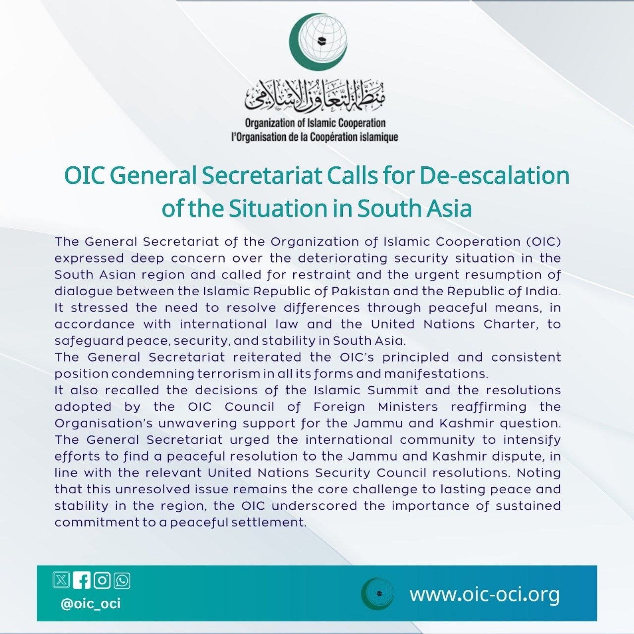 महासचिवालय ने अंतरराष्ट्रीय समुदाय से आग्रह किया कि वह जम्मू-कश्मीर विवाद के शांतिपूर्ण समाधान के लिए प्रयास तेज करे, जो संयुक्त राष्ट्र सुरक्षा परिषद के प्रासंगिक प्रस्तावों के अनुरूप हो. OIC ने कहा कि यह अनसुलझा मुद्दा दक्षिण एशिया में स्थायी शांति और स्थिरता के मार्ग में एक प्रमुख बाधा बना हुआ है और इसके समाधान के लिए दीर्घकालिक प्रतिबद्धता बेहद आवश्यक है.