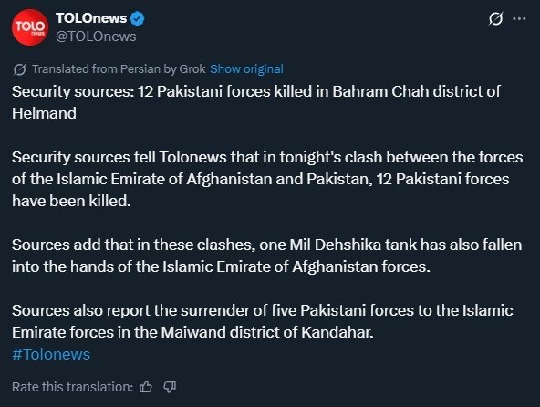 सुरक्षा सूत्रों के अनुसार, हेलमंद के बहरम चाह जिले में हुई झड़पों में 12 पाकिस्तानी सैनिक मारे गए और एक मिल देहशिका टैंक अफगान बलों के कब्जे में आ गया. इसके अलावा, कंधार के मायवंद जिले में पांच पाकिस्तानी सैनिकों ने तालिबान के सामने आत्मसमर्पण कर दिया.
