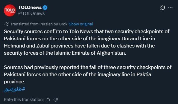 तालिबान सरकार के रक्षा मंत्रालय ने टोलो न्यूज (TOLOnews) को बताया कि इस्लामिक एमिरेट्स ऑफ अफगानिस्तान की सेनाओं ने कई पाकिस्तानी चौकियों पर कब्जा कर लिया है. कुनार और हेलमंद प्रांतों में एक-एक पाकिस्तानी चौकी को पूरी तरह नष्ट कर दिया गया.