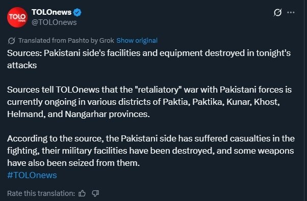 तालिबान ने 11 अक्टूबर की देर रात नंगरहर और कुनार प्रांतों में डुरंड लाइन के पास पाकिस्तानी सैन्य चौकियों पर बड़े पैमाने पर हमले शुरू किए. तालिबान का कहना है कि यह कार्रवाई पाकिस्तान द्वारा हाल में किए गए हमलों के जवाब में है. रिपोर्ट्स के मुताबिक इन हमलों में पाकिस्तान के कम से कम 12 सैनिकों की मौत हुई है.