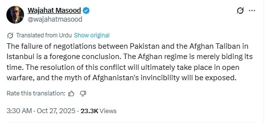 पाकिस्तान के वरिष्ठ पत्रकार वजाहत मसूद ने एक्स पर इस शांति वार्ता का भविष्य पहले ही लिख दिया है. उन्होंने लिखा है, "इस्तांबुल में पाकिस्तान और अफगान तालिबान के बीच वार्ता की विफलता एक पूर्वनिर्धारित निष्कर्ष है. अफ़गान शासन बस समय का इंतजार कर रहा है. इस संघर्ष का समाधान अंततः खुले युद्ध में होगा और अफगानिस्तान के अजेय होने का मिथक उजागर हो जाएगा."