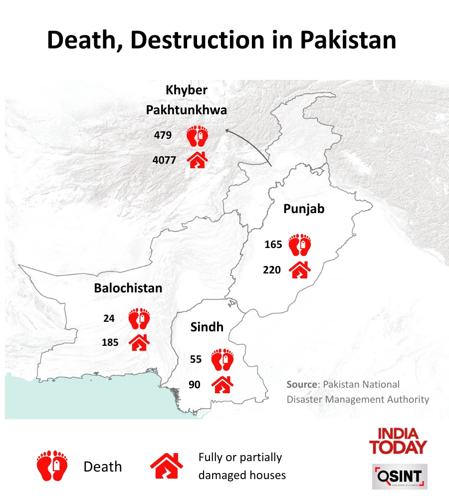 अब तक 1000 से ज्यादा लोग घायल हो चुके हैं. मरने वालों में 203 बच्चे शामिल हैं. अकेले खैबर में 480 मौतें और 340 घायल दर्ज किए गए हैं. पंजाब में 165 मौतें और 584 घायल हुए हैं. पाकिस्तान-अधिकृत कश्मीर में भी 23 लोगों की जान गई है.