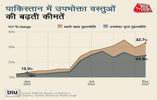 स्टेट बैंक ऑफ पाकिस्तान के अनुसार, पाकिस्तान में दिसंबर 2021 के मुकाबले दिसंबर 2022 तक मुद्रास्फीति दर 12.3 फीसदी से बढ़कर 24.5 फीसदी हो गई है. खाद्य सामानों की कीमतों में इजाफे की वजह से यह महंगाई देखने को मिली है. पिछले एक साल में ही पाकिस्तान में खाद्य मुद्रास्फीति 11.7 फीसदी से बढ़कर 32.7 फीसदी तक पहुंच गई है.