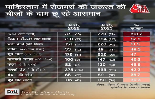 पाकिस्तान में 6 जनवरी, साल 2022 को जिस प्याज की कीमत 36.7 रुपये प्रति किलोग्राम थी, अब यानी 5 जनवरी 2023 को उसकी कीमत 220.4 रुपये प्रति किलो पहुंच गई है. इतना ही नहीं, पाकिस्तान में डीजल का दाम 61 फीसदी तो पेट्रोल की कीमत 48 फीसदी तक बढ़ गई है. वहीं हर घर में इस्तेमाल होने वाले आटे-चावल की कीमतें भी आसमान छू रही हैं. पिछले एक साल में सिर्फ गेहूं के दाम ही 50 फीसदी तक बढ़ गए हैं.