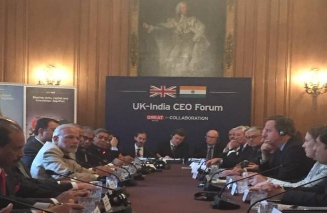 भारतीय समयानुसार लगभग शाम पांच बजे लंदन में 11 डाउनिंग स्ट्रीट में सीईओ फोरम की बैठक शुरू हुई. बैठक में प्रधानमंत्री मोदी ने कहा, यूके और भारत आसानी से एक-दूसरे से मेल खाते हैं जो अपने आप में बड़ी बात है. बैठक में मौजूद ब्रिटिश पीएम डेविड कैमरन ने कहा, 'दोनों देशों की राजनीतिक इच्छा शक्ति है कि हमारे आर्थिक संबंध आगे बढ़ाए जाएं.' प्रधानमंत्री मोदी ब्रिटेन की बड़ी कंपनियों के सीईओ से भी मिले और कारोबार के क्षेत्र में दोनों देशों के बीच सहयोग को लेकर बात हुई. पीएम मोदी ने कहा कि हम अपने रेलवे स्टेशनों को पीपीपी मॉडल के मुताबिक विकसित करना चाहते हैं. डिफेंस मैन्यूफैक्चरिंग हमारी रीढ़ है. उन्होंने कहा कि भारत और यूके आर्थिक तौर पर एक-दूसरे के लिए बने हैं और ये इन संबंधों को प्राइवेट सेक्टर के सीईओ को प्रेरित करना होगा.