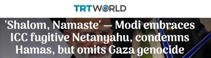 तुर्की के सरकारी मीडिया TRT World ने अपनी रिपोर्ट में लिखा, "भारत के मोदी ने नेसेट में इजरायल की खुलकर प्रशंसा की, जिसे गाजा युद्ध के कारण अंतरराष्ट्रीय दबाव झेल रहे नेतन्याहू के लिए बड़ी कूटनीतिक सफलता माना जा रहा है." टीआरटी ने हेडलाइन में लिखा, "शालोम, नमस्ते’ - मोदी ने आईसीसी के भगोड़े नेतन्याहू को गले लगाया, हमास की निंदा की, लेकिन गाजा का जिक्र नहीं किया." रिपोर्ट में आगे कहा गया, "गाजा में इजरायली बलों की कार्रवाई में हजारों फिलिस्तीनियों की मौत और भारी नुकसान पर चुप रहते हुए मोदी ने अक्टूबर 2023 के हमलों की निंदा पर ज्यादा जोर दिया."