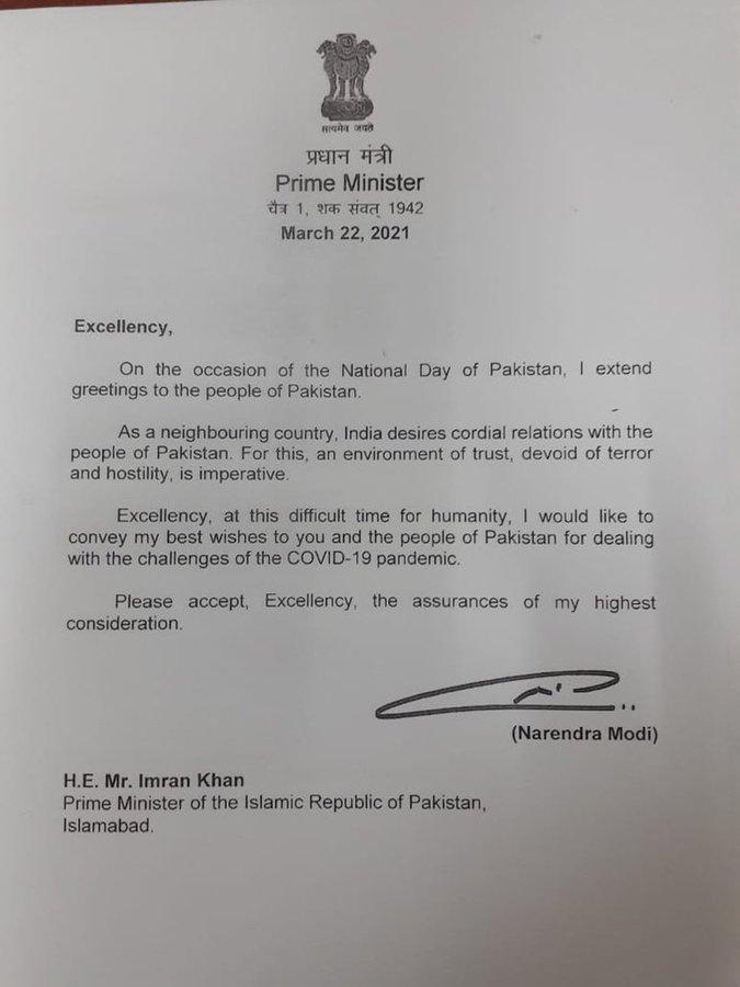 प्रधानमंत्री नरेंद्र मोदी ने पाकिस्तान के नेशनल डे पर पीएम इमरान खान को बधाई दी है. पीएम मोदी ने खत लिखकर कहा कि पड़ोसी देशों में भरोसे का रिश्ता होना चाहिए. आतंकवाद की कोई जगह नहीं है. पाकिस्तान से भारत दोस्ताना संबंध चाहता है और दोस्ती के लिए आतंक मुक्त माहौल जरूरी है.