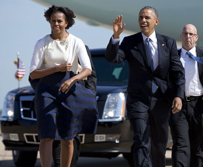 यही नहीं जब वे होस्टन पहुंचे थे तब भी हवा तेज चल रही थी. हवाई जहाज से उतरते वक्त भी मिशेल की स्कर्ट हवा में उड़ने लगी, लेकिन ओबामा ने स्कर्ट पकड़ ली. आपको बता दें मिशेल ने सफेद टॉप के साथ नीली और काली धारियों वाली स्कर्ट पहनी हुई थी.