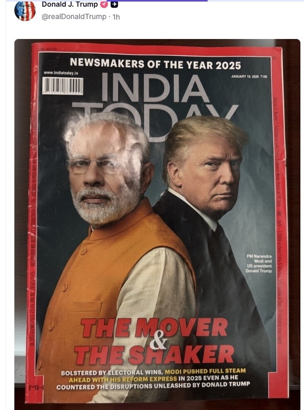 खास बात ये भी है कि डोनाल्ड ट्रंप ने सोशल मीडिया प्लेटफॉर्म ट्रुथ पर इंडिया टुडे मैगजीन के कवर पेज को भी अपने प्रोफाइल पर शेयर किया है. इंडिया टुडे के 50वें साल के इस कवर पर प्रधानमंत्री नरेंद्र मोदी और डोनाल्ड ट्रंप की तस्वीर है. न्यूजमेकर्स ऑफ द ईयर 2025 के इस कवर में दोनों नेता एक-दूसरे की ओर पीठ किए हुए नजर आते हैं. सवाल यह है कि क्या आने वाले समय में तस्वीर बदलेगी. क्या हम दोनों नेताओं को हाथ मिलाते हुए देखेंगे.