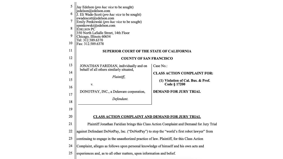 जे एडल्सन नामक लॉ फर्म की ओर से जोनाथन फरीदियां ने अमेरिकी स्टार्ट अप कम्पनी डू नॉट पे के खिलाफ मुकदमा दर्ज कराया है.'डू नॉट पे' कुछ महीनों पहले तब चर्चा में आई जब उसने कृत्रिम बुद्धिमता यानी आर्टिफिशियल इंटेलिजेंस यानी एआई से रोबोट वकील बनाने का खुलासा किया.जनवरी में इसका ट्रायल हुआ.मार्च में उसकी पहली पेशी की पेशकश हुई और मुकदमा दर्ज हो गया.