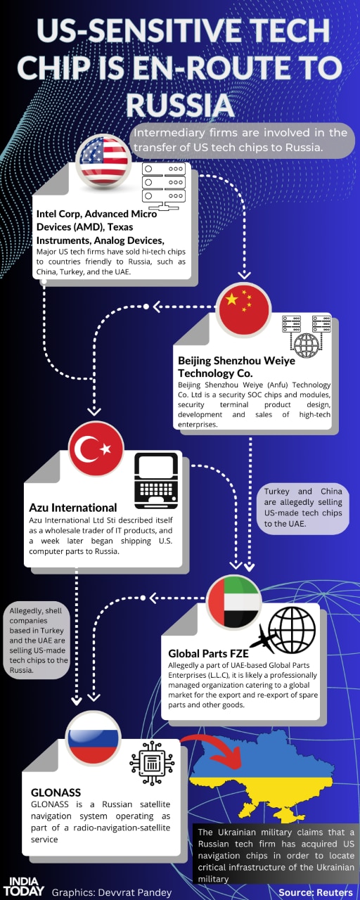 अब जांच के दौरान अमेरिका की कंपनी इंटेल को लेकर भी जरूरी जानकारी सामने आई है. पता चला है कि रूस को बड़ी संख्या में टेक्नोलॉजी भेजी गई है. आंकड़े बताते हैं कि पिछले साल एक अप्रैल से लेकर 31 अक्टूबर के बीच ही 457 मिलियन डॉलर का कारोबार इंटेल का रूस के साथ हुआ है. इसी तरह सेमिकंडक्टर की आपूर्ति रूस ने यूएई और तु्र्की से पूरी की है. वैसे इस सीक्रेट डील में यूएई की कंपनी Global Parts FZE, तुर्की की  Azu International ने भी बड़ी भूमिका निभाई है. असल में हुआ ये है कि अमेरिका से तुर्की और चीन की कंपनियों ने ये सीक्रेट टेक्नोलॉजी खरीदी, फिर उस टेक्नोलॉजी को यूएई वाली कंपनियों को भेज दी. फिर वहां से वो चिप रूस तक पहुंची. ऐसे में तय रणनीति के तहत इस पूरी डील दो-तीन देशों के जरिए पूरा किया गया.