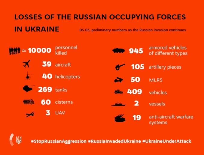 यूक्रेन के विदेश मंत्री दिमित्रो कुलेबास का दावा है कि रूस ने 5 मार्च तक इस संघर्ष में अपने 10,000 सेना के जवानों को खो दिया है. इसके अलावा रूसी सेना के 79 फाइटर जेट और हेलीकॉप्टर यूक्रेन ने मार गिराए हैं. साथ ही 269 रूसी टैंक, 945 बख्तरबंद लड़ाकू वाहन और 45 मल्टी रॉकेट लॉन्च सिस्टम को भी यूक्रेन ने तबाह कर दिया है. दुनिया की महाशक्तियों में शामिल रूस को जंग में टक्कर दे रहे यूक्रेन के हौसले बुलंद है और जेलेंस्की सरकार का कहना है कि रूस यह लड़ाई हार चुका है. उसे अपनी सेना वापस बुला लेनी चाहिए.