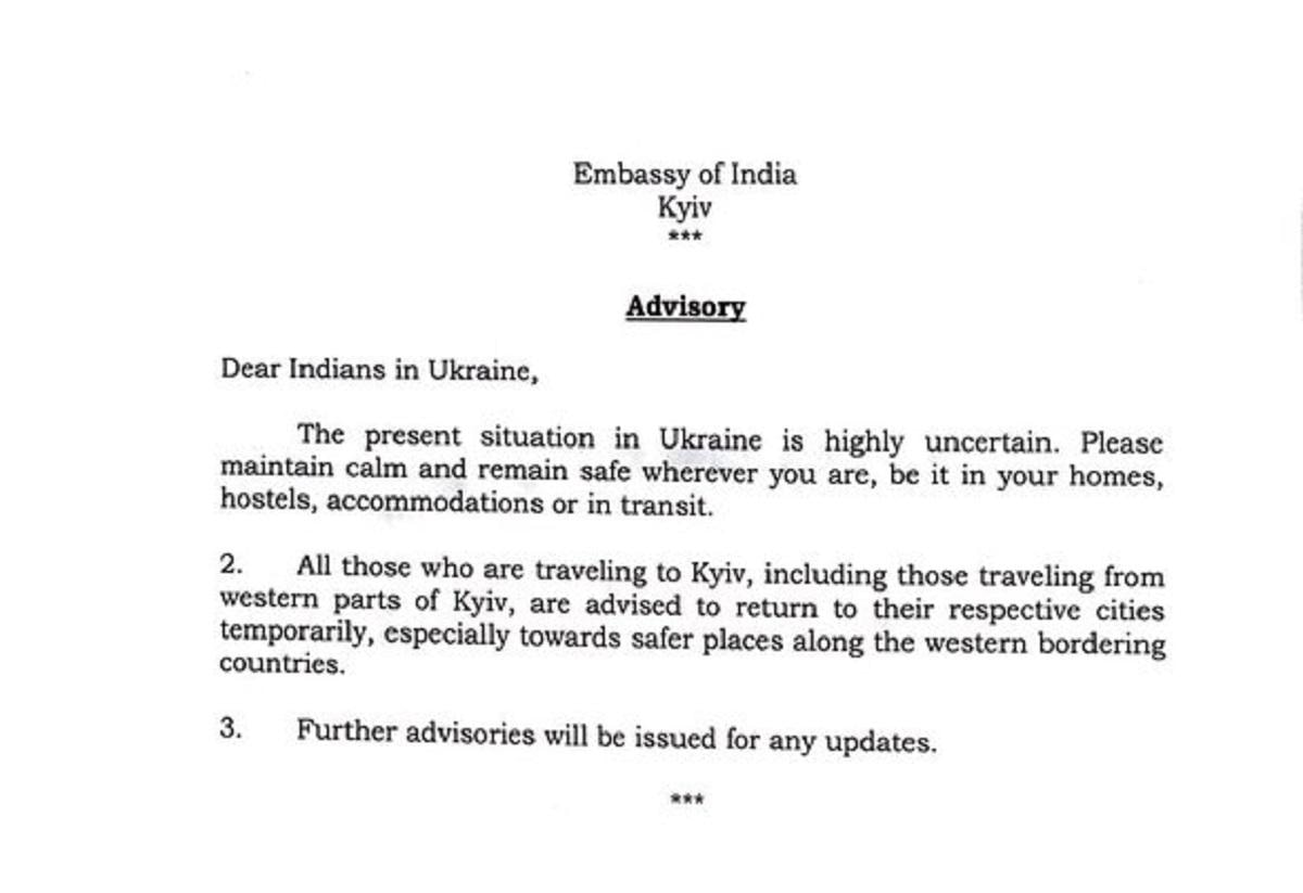 यूक्रेन में बिगड़ते हालातों के बीच भारत ने वहां मौजूद लोगों के लिए नई एडवाइजरी जारी की है. इसमें कहा गया है कि स्थिति अभी खराब है, ऐसे में जहां हैं, वहीं रहें. लोगों से अपने घरों, हॉस्टल आदि में ही रुकने को कहा गया है. साथ ही कहा गया है कि जो लोग यूक्रेन की राजधानी कीव या वेस्टर्न कीव की तरफ गए हैं तो वापस अपने घरों की तरफ लौट जाएं.