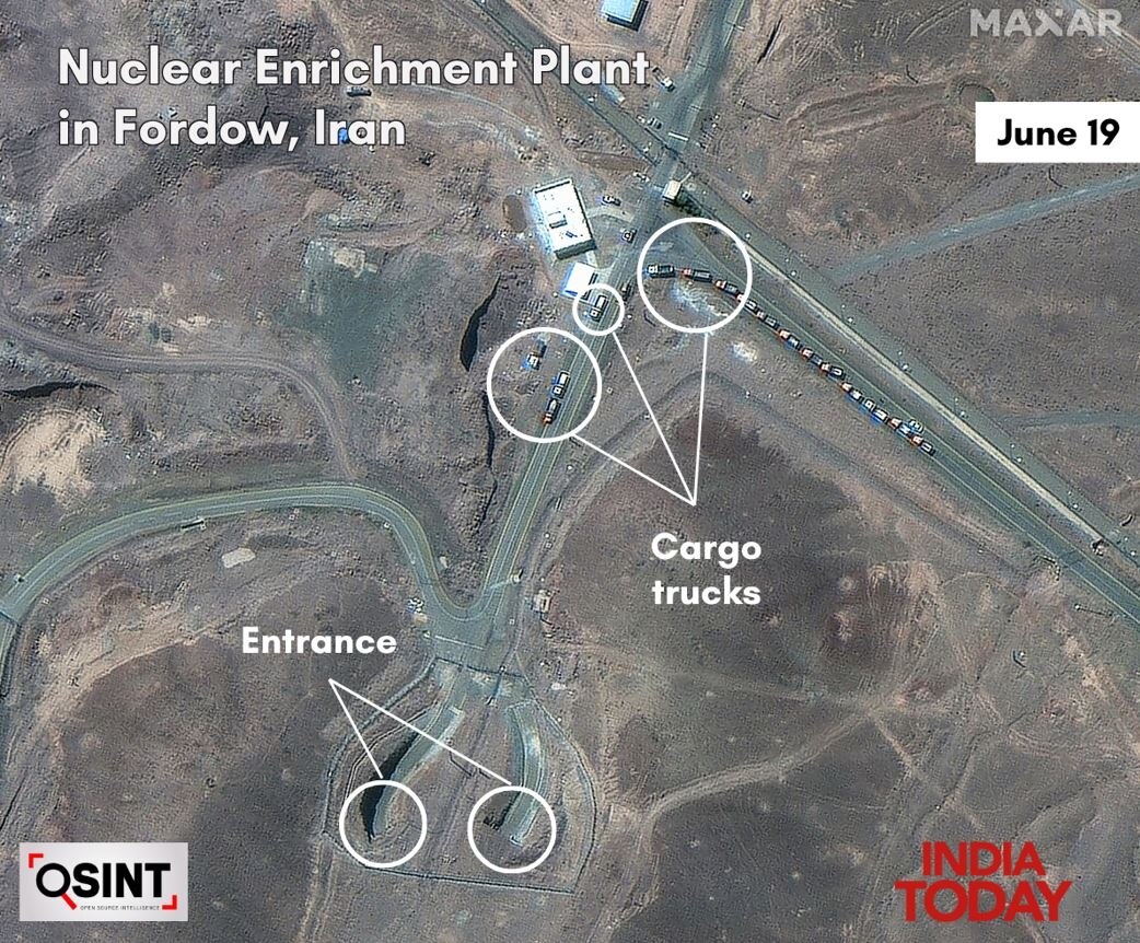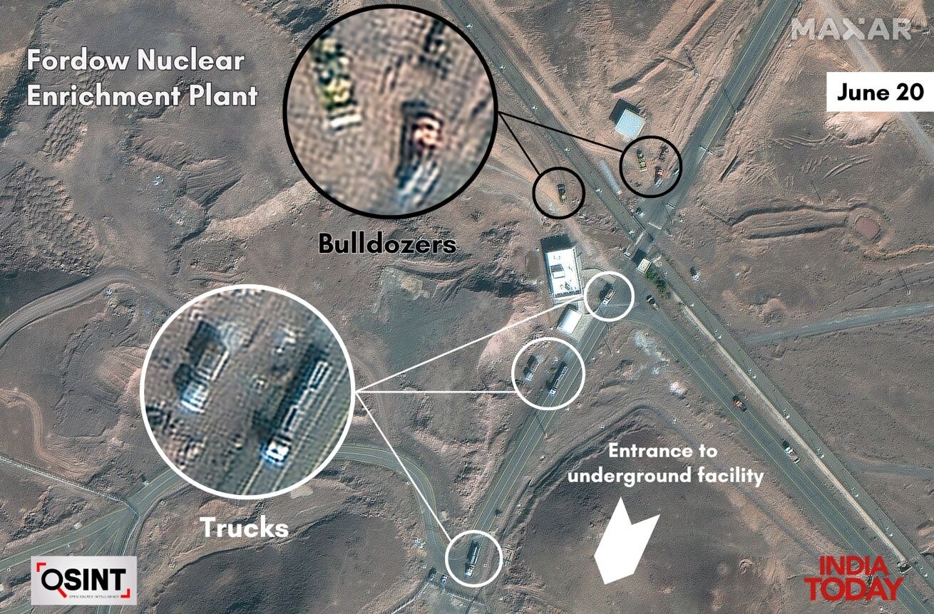 अमेरिकी कंपनी मैक्सार टेक्नोलॉजीज की तरफ इंडिया टुडे की ओपन-सोर्स इंटेलिजेंस (OSINT) टीम को मुहैया कराई गईं हाई-रिज़ॉल्यूशन वाली सैटेलाइट तस्वीरों से पता चला है कि 19 और 20 जून को फोर्डो न्यूक्लियर साइट पर असामान्य ग्राउंड एक्टिविटीज हुईं.