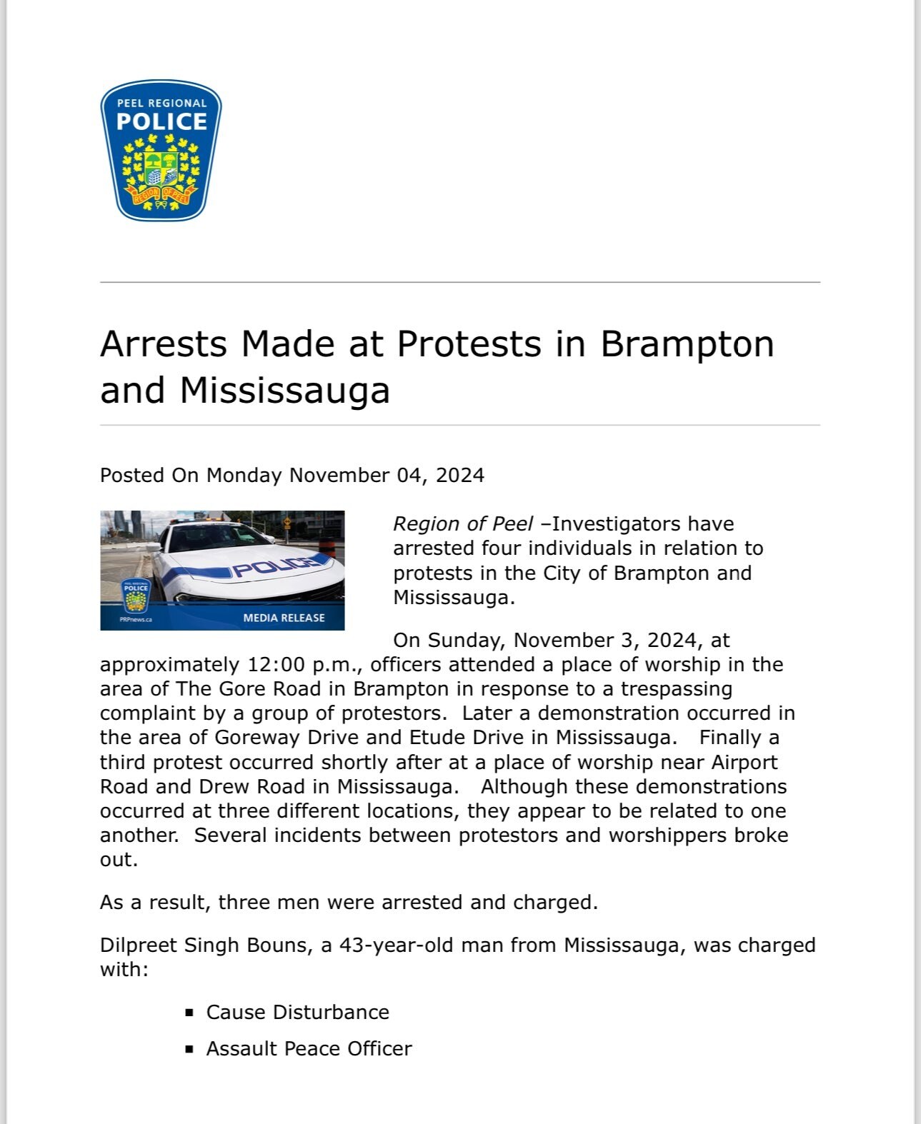 पील रीजनल पुलिस ने इसकी जानकारी देते हुए कहा कि इन तीनों को ब्रैम्पटन में ओंटारियो कोर्ट ऑफ जस्टिस के समक्ष पेश किया जाएगा. गिरफ्तार किए गए लोगों में 23 साल का विकास और 31 साल का अमृतपाल सिंह है. इस मामले में चौथे शख्स को भी गिरफ्तार किया गया था लेकिन बाद में उसे छोड़ दिया गया था.