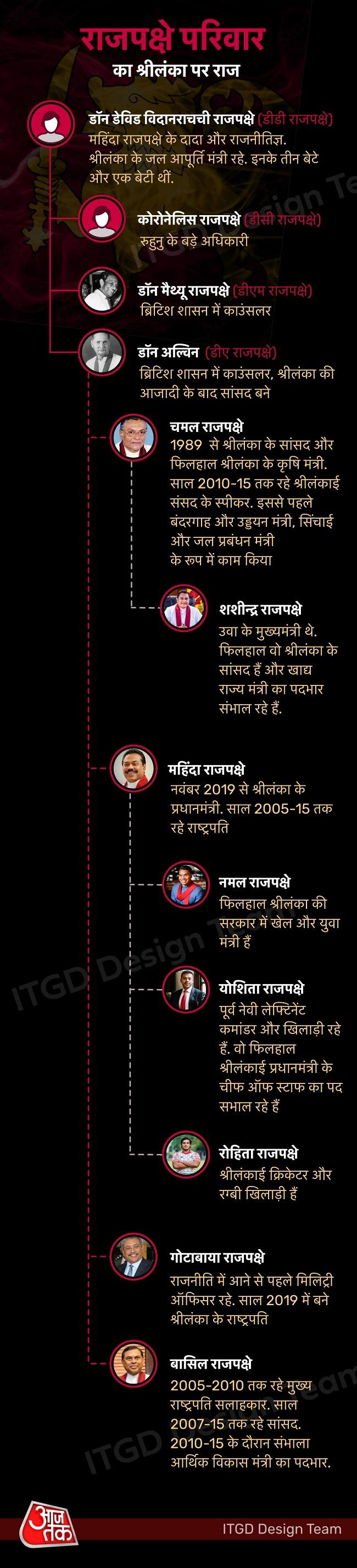 गोटाबाया के भाई बासिल राजपक्षे फिलहाल श्रीलंका के वित्त मंत्री हैं और चमल राजपक्षे कृषि मंत्री हैं. चमल साल 1989 से ही श्रीलंका के सांसद हैं. महिंदा राजपक्षे के बेटे नमल राजपक्षे श्रीलंका के युवा और खेल मंत्री हैं. राजपक्षे परिवार से लगभग 7 लोग श्रीलंका की सत्ता के शीर्ष पदों पर काबिज हैं, जिसे लेकर विपक्ष सहित लोगों में भी गुस्सा भरा है.