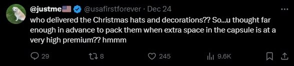 'Justme' नाम के एक्स हैंडल ने कमेंट में लिखा, "क्रिसमस की टोपियां और डेकोरेशन किसने पहुंचाई?? तो...आपने उन्हें पैक करने के बारे में पहले से ही सोच लिया था, जबकि कैप्सूल में जगह की बहुत ज्यादा जरूरत होती है??"