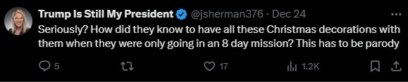 'Trump Is Still My President' नाम के एक एक्स यूजर ने पूछा, "उन्हें कैसे पता चला कि ये सभी क्रिसमस के डेकोरेशन उनके साथ हैं, जबकि वे सिर्फ 8 दिन के मिशन पर जा रहे थे? यह तो पैरोडी ही होगी."