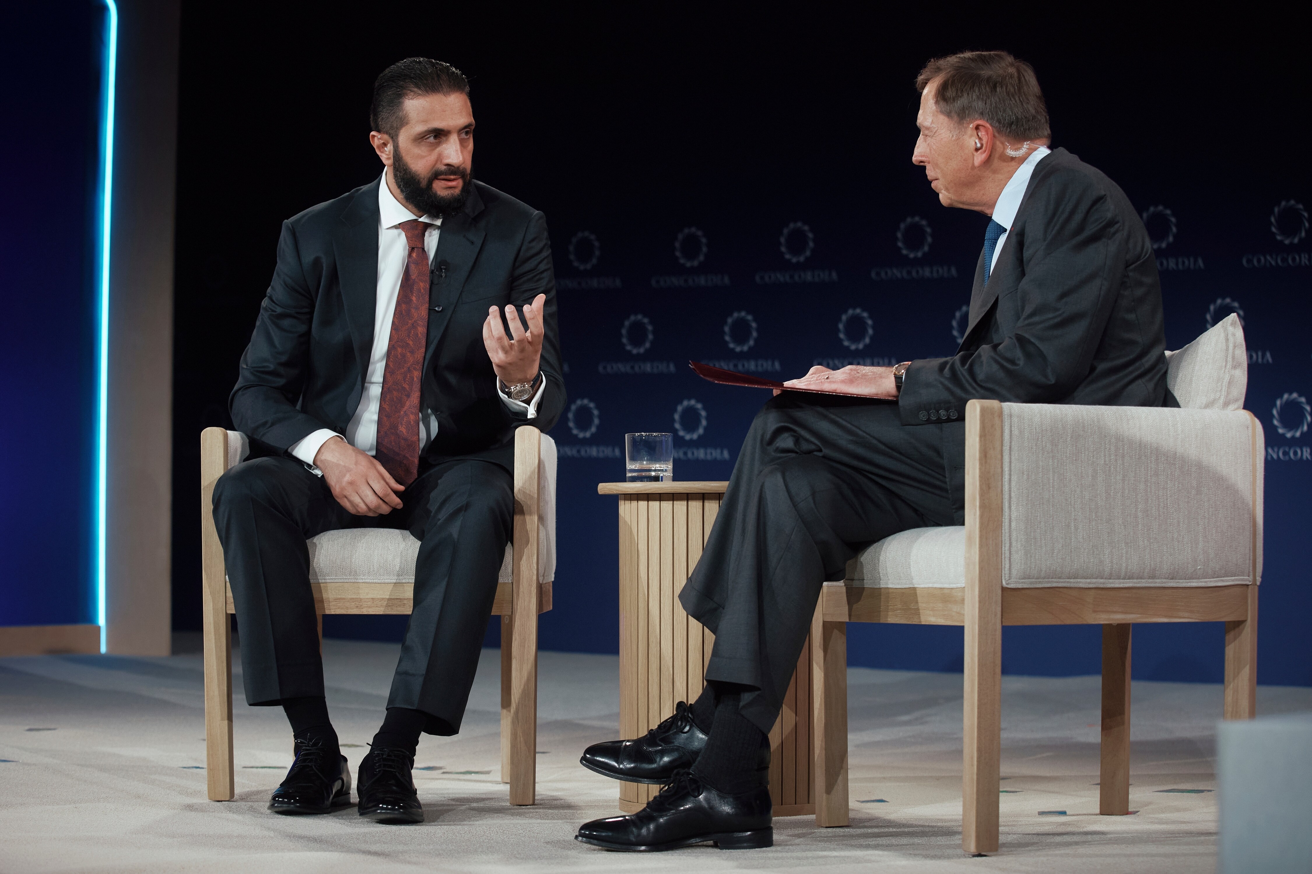 पूर्व सीआईए डायरेक्टर डेविड पेट्रायस सीरियाई राष्ट्रपति अहमद अल शरा से पूछते हैं, "जब मैं इराक में ऑपरेशन सर्ज की कमान संभाल रहा था, तब हम अलग-अलग पक्ष में थे... कृपया हमें यह समझने में मदद करें कि 20 साल पहले इराक में अलकायदा से निकलकर आप आज यहां किस तरह पहुंचे, सीरिया के राष्ट्रपति का पद आपने कैसे हासिल किया?"