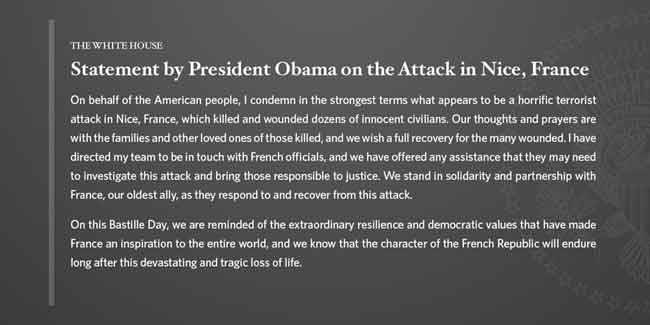 अमेरिकी राष्ट्रपति बराक ओबामा ने नाइस में हुए इस आतंकी हमले की कड़ी निंदा की है. साथ ही उन्होंने हमले की जांच में फ्रांस को मदद की पेशकश भी की है. दूसरी तरफ फ्रांस के पूर्व राष्ट्रपति निकोलस सरकोजी ने हमले पर गहरा दुख जताया है. उन्होंने ट्वीट कर हमले में लोगों के मारे जाने पर शोक व्यक्त किया है.