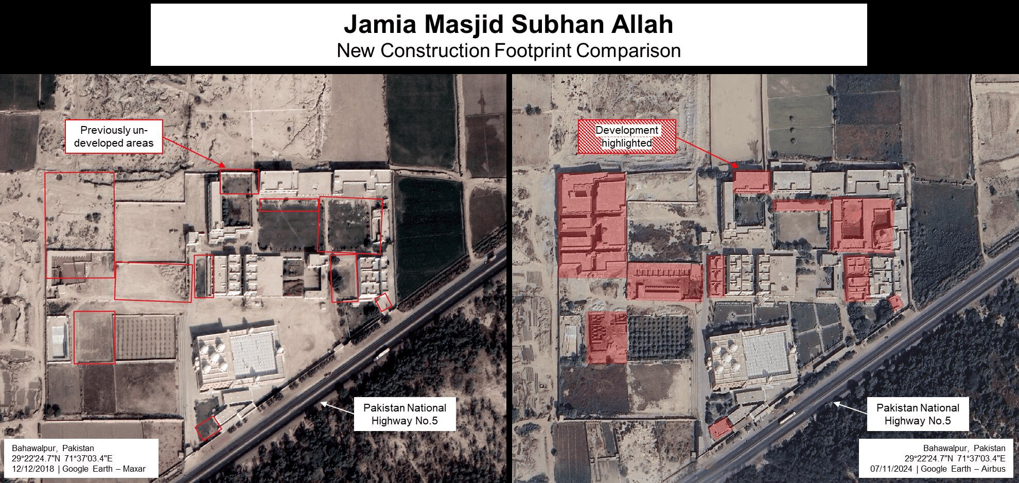 सैटेलाइट तस्वीरों के मुताबिक, 'जामिया मस्जिद सुब्हान अल्लाह' का आकार दोगुना होकर 18 एकड़ से ज्यादा हो गया है. यह मस्जिद 2011-12 में बनी थी, लेकिन 2022 के आखिर से यहां तेजी से निर्माण कार्य बढ़ गया. यानी ठीक उसी समय जब पाकिस्तान को ग्रे लिस्ट से हटाया गया था. आजतक को यह सैटेलाइट तस्वीरें 'द इंटेल लैब' के जियो-इंटेलिजेंस रिसर्चर डेमियन साइमन ने उपलब्ध कराए हैं.