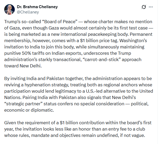 अपने ट्वीट के अंत में डॉ. चेलानी लिखते हैं, 'सबसे बुनियादी बात यह है कि भारत को ट्रंप के रिकॉर्ड को ध्यान में रखना चाहिए. ‘बोर्ड ऑफ पीस’ ‘बोर्ड ऑफ कॉन्फ्लिक्ट’ में भी बदल सकता है.'