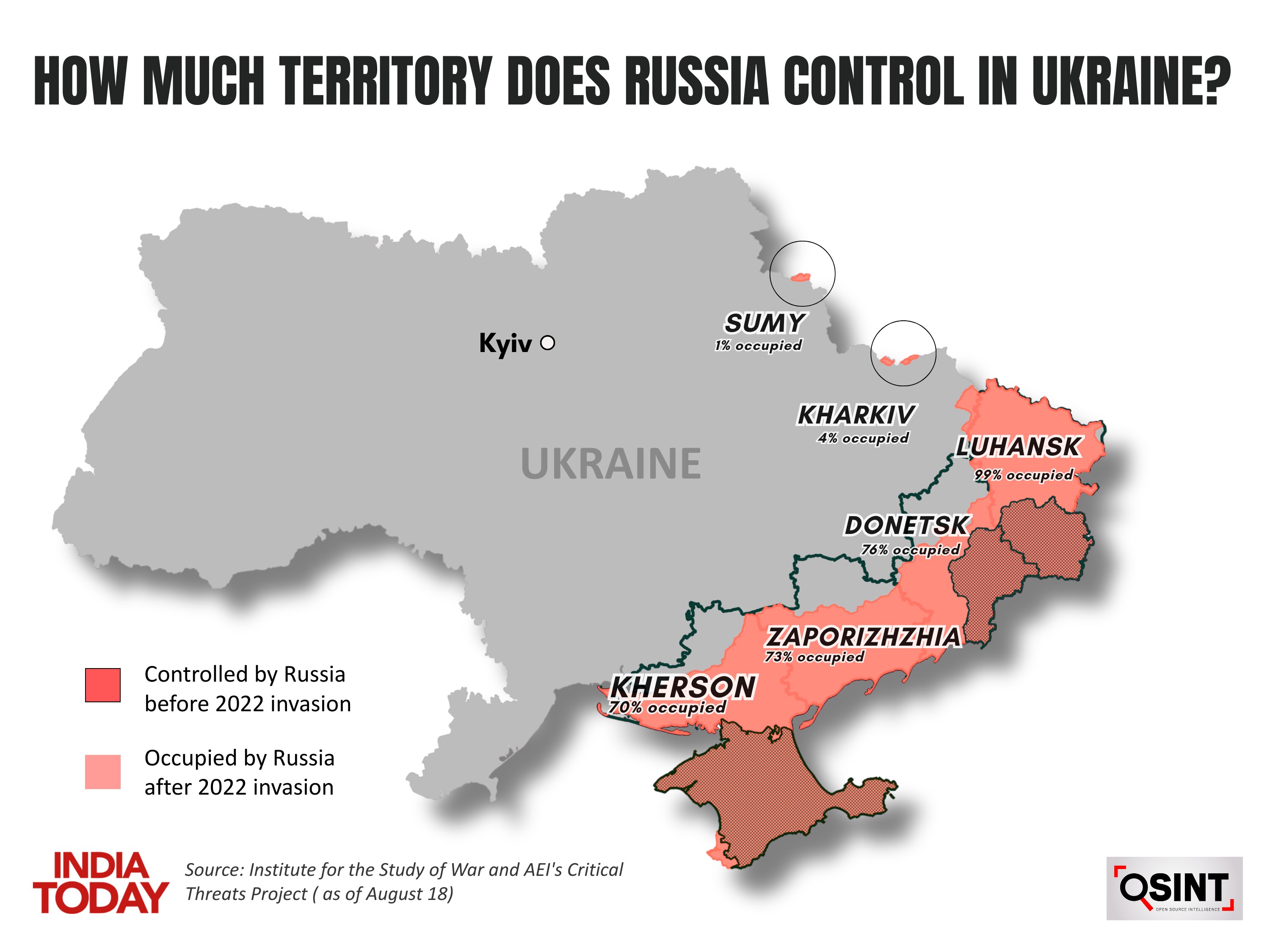 अमेरिकी थिंक टैंक इंस्टीट्यूट फॉर द स्टडी ऑफ वॉर के अनुसार, रूस के पास सूमी और खार्किव क्षेत्रों के छोटे-छोटे हिस्से हैं, जिनका कुल क्षेत्रफल लगभग 440 वर्ग किलोमीटर है. यूक्रेन डोनबास के लगभग 6,600 वर्ग किलोमीटर क्षेत्र पर नियंत्रण रखता है, जिसमें दोनेत्स्क और लुहांस्क क्षेत्र शामिल हैं. रूस इन दोनों ही क्षेत्रों की मांग कर रहा है.