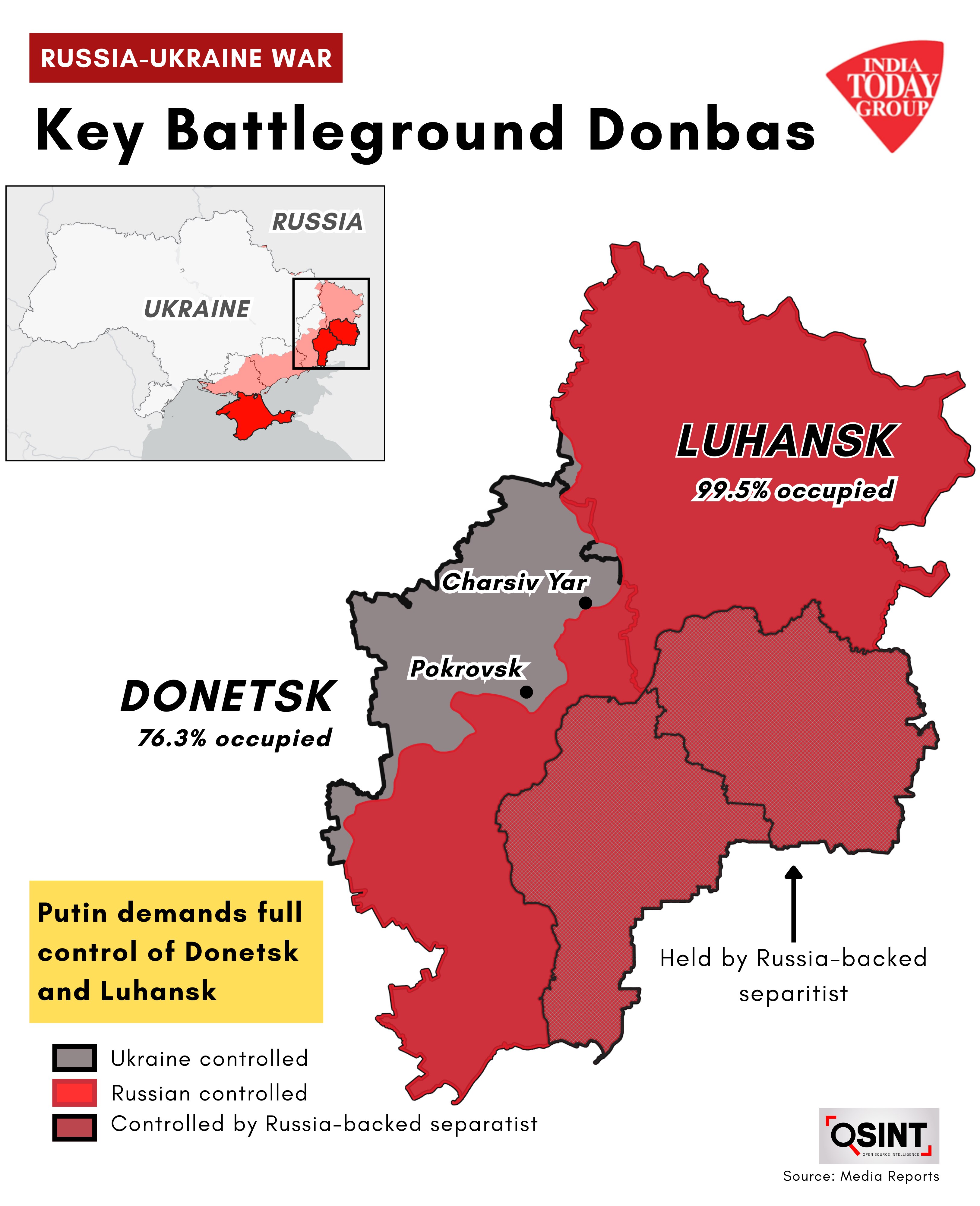 रूस पूर्वी यूक्रेन के डोनबास क्षेत्र के लगभग 46,570 वर्ग किमी या 88% हिस्से पर नियंत्रण रखता है, जिसमें लुहांस्क और दोनेत्स्क क्षेत्र का लगभग 76% हिस्सा शामिल है.