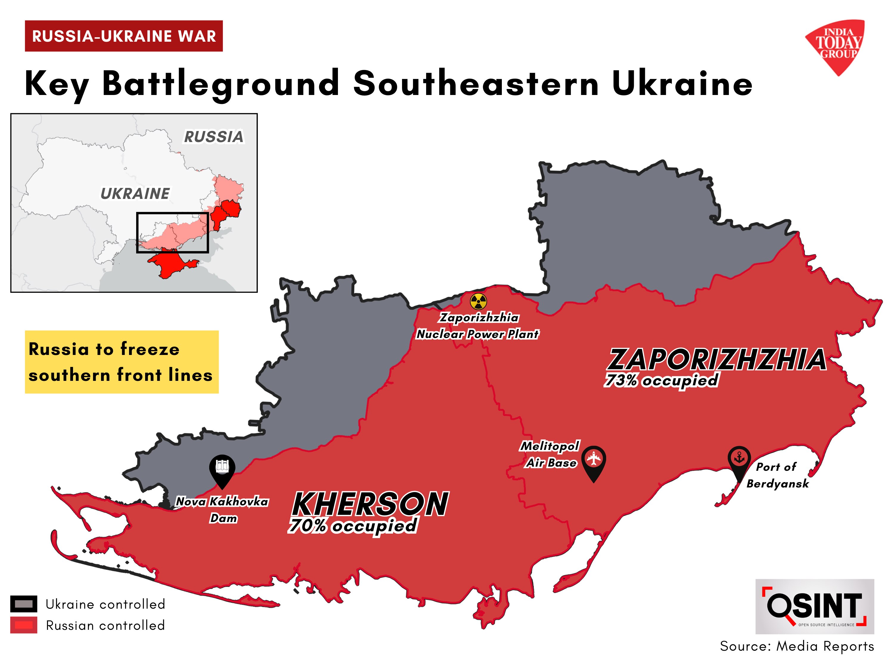 रूसी सेना दक्षिण-पूर्वी यूक्रेन के जापोरिज्जिया और खेरसॉन क्षेत्रों के लगभग 74%, यानी लगभग 41,176 वर्ग किलोमीटर क्षेत्र पर नियंत्रण रखती है. यूक्रेन इन दोनों क्षेत्रों के लगभग 14,500 वर्ग किलोमीटर क्षेत्र को कंट्रोल करता है.