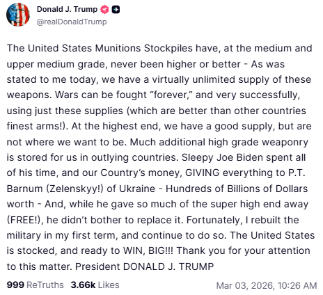 ट्रंप ने ट्रुथ सोशल पर लिखा, 'हमारे पास इन हथियारों की लगभग असीमित आपूर्ति है. इन हथियारों का इस्तेमाल करके युद्ध अनंत काल तक और बहुत सफलतापूर्वक लड़े जा सकते हैं.'