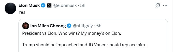 वॉल स्ट्रीट में मस्क की कंपनी टेस्ला के शेयरों में भारी गिरावट आई. टेस्ला के शेयर 14.3% गिरे और कंपनी की मार्केट वैल्यू में करीब 150 बिलियन डॉलर का झटका लगा, जो टेस्ला के इतिहास की सबसे बड़ी एक-दिनी गिरावट है. शेयर बाज़ार बंद होने के चंद मिनट बाद मस्क ने X पर एक पोस्ट के जवाब में 'Yes' लिखा, जिसमें ट्रंप के खिलाफ महाभियोग की बात कही गई थी.