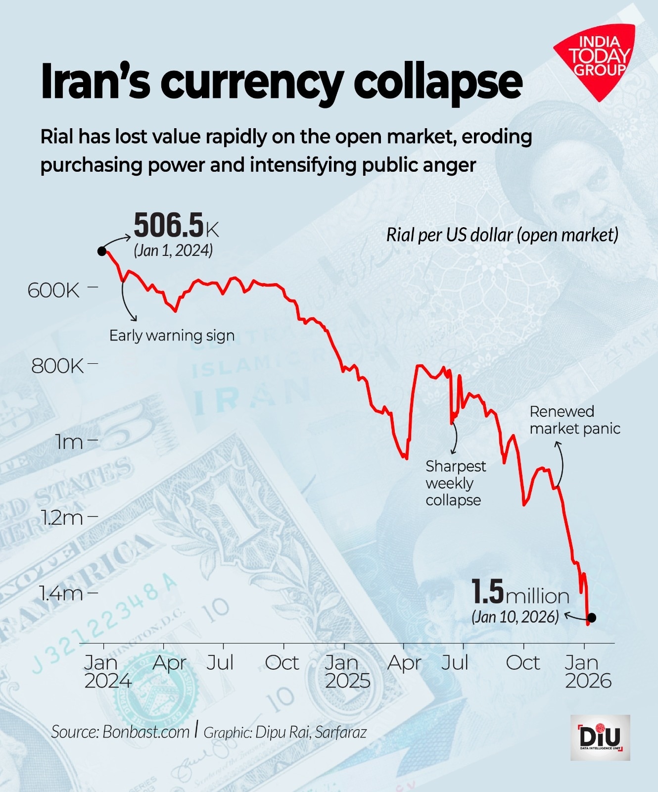 पिछले दो साल में रियाल अपनी कीमत का लगभग दो-तिहाई हिस्सा खो चुका है. साल 2024 में 1 डॉलर की कीमत करीब 5 लाख रियाल थी. फिर जनवरी 2026 तक 1 डॉलर की कीमत 15 लाख रियाल से ज्यादा (10 जनवरी तक के आंकड़े) हो गई. इस गिरावट ने आम ईरानियों की बचत और खरीदने की ताकत पूरी तरह तोड़ दी है.