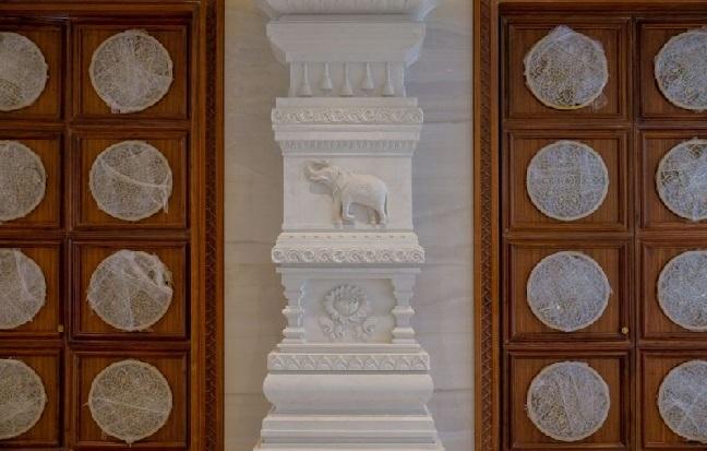 नौ ऊंचे-ऊंचे खंभे, सुसज्जित पिलर्स और सफेद मार्बल पर हैंडक्राफ्ट मूर्तिकला इस मंदिर के समृद्ध इंटीरियर और एक्सटीरियर का हिस्सा हैं. मंदिर के बड़े-बड़े लकड़ी के दरवाजे और कंक्रीट के लंबे पिलर्स पर घंटियों, हाथियों और फूलों की सजावट है.
