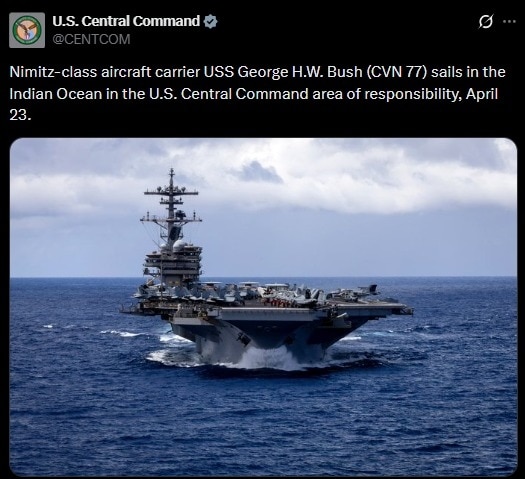 USS जॉर्ज एच.डब्ल्यू. बुश (CVN-77) ने अमेरिकी सेंट्रल कमांड के क्षेत्राधिकार में प्रवेश कर लिया है जो क्षेत्र में अमेरिकी नौसेना की मौजूदगी के काफी विस्तार को दिखाता है. अमेरिकी सेंट्रल कमांड के अनुसार, ये निमित्ज़-क्लास विमानवाहक पोत अब हिंद महासागर में संचालित हो रहा है जो चल रहे सैन्य तैनाती को और मजबूत करेगा. इसके आगमन के साथ ही अब इस इलाके में एक साथ तीन अमेरिकी नौसेना के विमानवाहक पोत सक्रिय हैं.