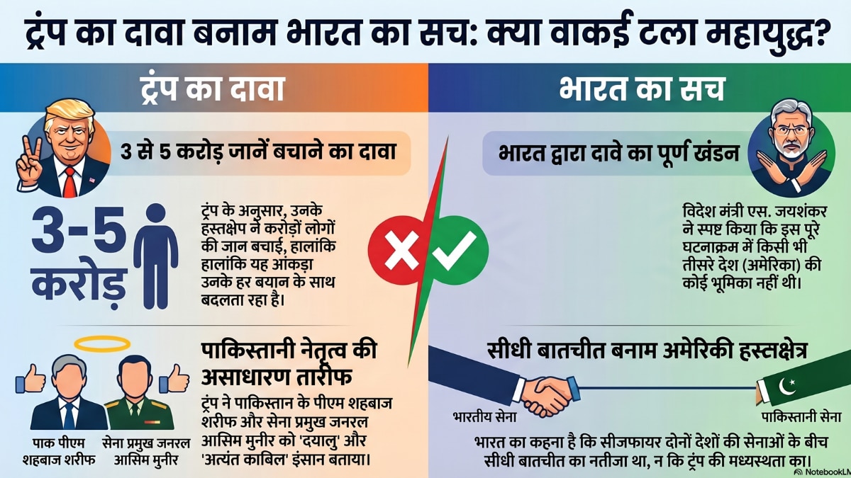 फरवरी में जब ट्रंप ने यही दावा किया था तब उन्होंने कहा था कि पाकिस्तान के प्रधानमंत्री शरीफ ने उन्हें बताया कि 3.5 करोड़ लोग मर सकते थे. अब रविवार की पोस्ट में यह आंकड़ा बढ़कर '3 से 5 करोड़' हो गया. यानी हर बार जब ट्रंप यह कहानी दोहराते हैं तो मरने वालों की संख्या बढ़ती जाती है. इससे पहले भी ट्रंप ने कई बार कह चुके हैं उनकी वजह से भारत-पाकिस्तान के बीच महायुद्ध रुका. नहीं तो बहुत बड़ा कुछ होने वाला था.