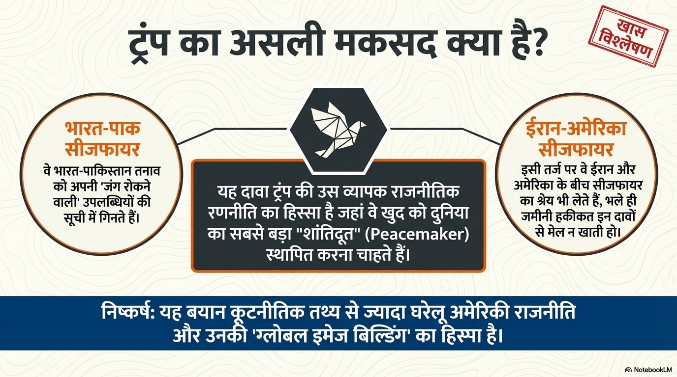 ट्रंप ने भारत-पाकिस्तान के इस मामले को उन कुछ बड़े कामों में गिनाया है जो उन्होंने दुनिया में जंग रोकने के लिए किए हैं. इसमें ईरान-अमेरिका जंग का सीजफायर भी शामिल है. ट्रंप खुद को दुनिया का सबसे बड़ा शांतिदूत बताने की कोशिश करते हैं.