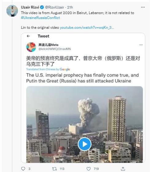 वहीं एक चीनी भाषा वाले ट्विटर अकाउंट से भी एक वीडियो शेयर किया गया. जिसमें बताया गया कि पुतिन द ग्रेट ने यूक्रेन पर हमला कर दिया. लेकिन असल में ये वीडियो बेरुत का साल 2020 का था. इस हादसे में 200 लोगों की मौत हो गई थी.