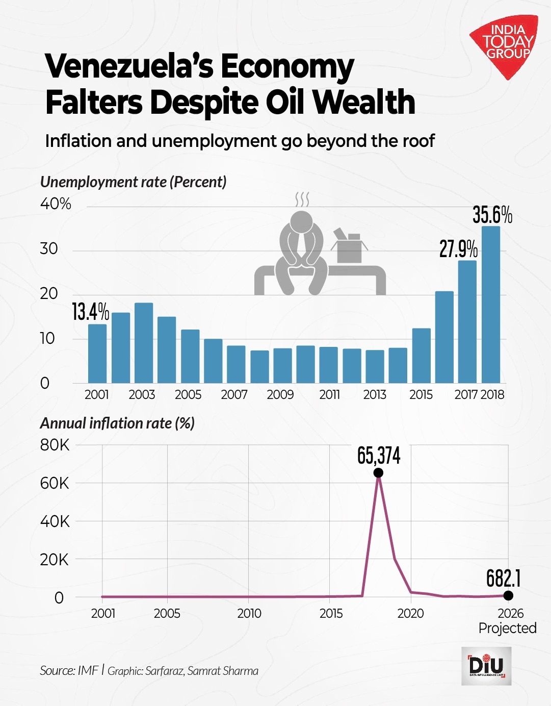 अर्थव्यवस्था ढहने के बाद वेनेजुएला में महंगाई पर कोई काबू नहीं रहा. रोजमर्रा की चीजों की कीमतें आसमान पर पहुंच गईं. यहां तनख्वाह का कोई मतलब नहीं रह गया. संसाधन कम हुए, अपराध बढ़ा. फैक्ट्रियां बंद होने लगीं. नौकरियां खत्म होती चली गईं. नतीजा ये हुआ कि बेरोजगारी तेजी से बढ़ी. उपलब्ध आंकड़ों के मुताबिक 2014 में बेरोजगारी दर 8% थी जो 2018 में बढ़कर 35.6% हो गई यानी चार गुना से भी ज्यादा.
